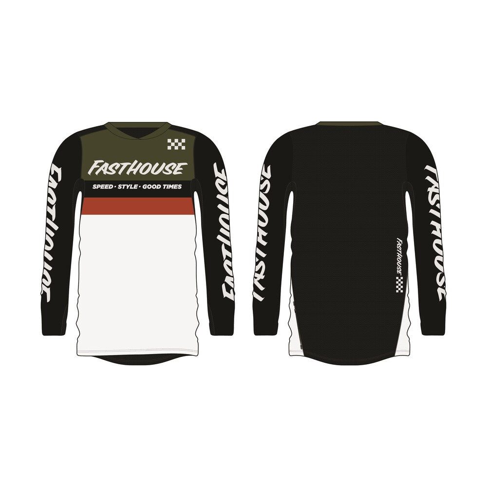 - FastDri fabric wicks moisture away from the body. - Fully dyed fabrics to ensure true long lasting color. - V-cut stretch collar to reduce pressure against neck. - High quality silk screened graphic on front chest. - Slight drop tail on pack panel for full coverage while riding. - Overlocked stitching for improved durability. - 94% Polyester, 6% Spandex. - Athletic jersey fit.