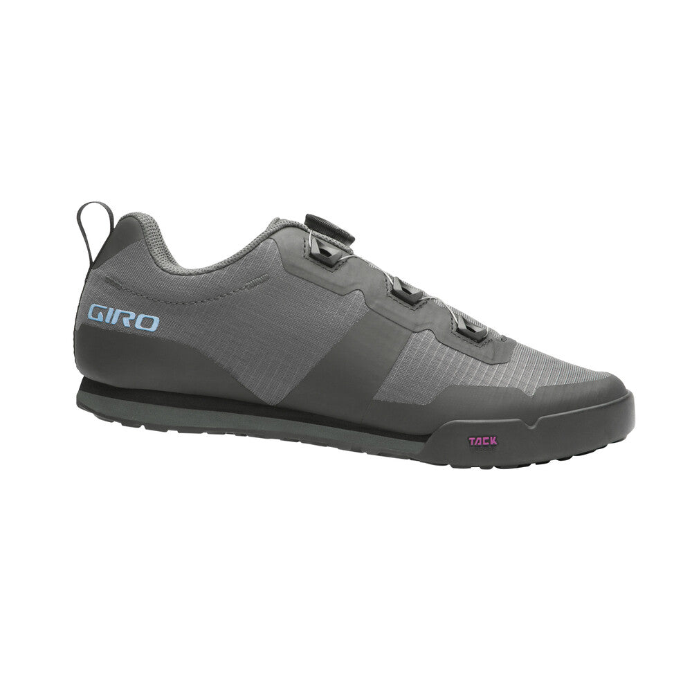 ALL TERRAIN STYLE WITH TENACIOUS GRIP The women’s Tracker™ fits the need for a cycling/e-bike friendly flat pedal shoe that’s light, comfortable and breathable enough for all-day adventures, yet doesn’t sacrifice grip or performance when you need it. Built on our new last, placing the foot closer to the pedal and featuring a flat profile for optimal pedal contact, the Tracker has direct lineage to the performance of our more aggressive flat pedal models without any excess bulk. The Tack™ Rubber outsole engages flat pedal pins with confidence and a duallayer EVA midsole provides comfort for off the bike hikes. A single, tongue mounted BOA® L6 dial makes for quick on/off and micro adjustment for a supportive fit. Upper: -Textile upper -Thermo-bonded PU overlays Outsole: -Tack™ Rubber outsole -Dual-layer EVA -Gamma tread design optimized for pedal pins Footbed: -Die-cut footbed Weight: -303 grams (size 39) Sizing: -Women’s 36 – 43 whole sizes only Closure: -BOA® L6 dial with stainless steel laces and injection molded lace guides Cleat Compatibility: -Flat pedal only / no cleat
