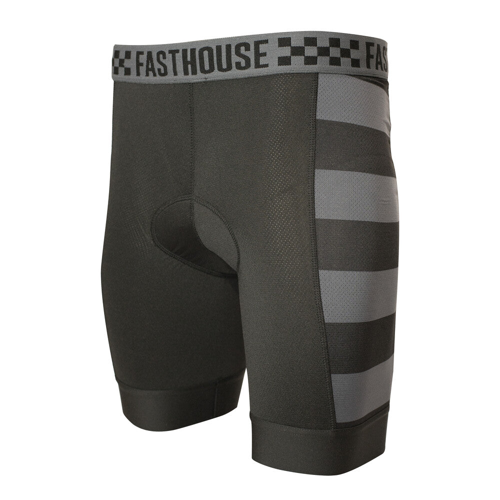 Our Everywhere Chamois Liner. Liner Features: - 87% Polyester, 13% Spandex material. - Ultrathin breathable stretch mesh fabric. - Jacquard Fasthouse checker elastic waistband. - Premium chamois pad with stamped FH logo. - Dye sublimated black & grey stripe side panels. - Microdot silicone grip on lower thigh bands. - 8.5" inseam length, stretch form fit. Pad Features: - Ergonomically designed for anatomical body contouring. - High density five layer foam structure for improved comfort. - Anti-bacterial, mildew resistant moisture wicking materials. - Embedded anti-shock gel pockets for increased protection. - 5mm perforated holes on underside for superior ventilation.