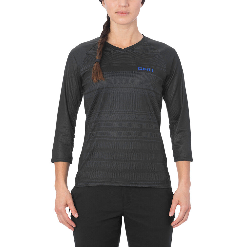 THE WOMEN'S ROUST 3/4 JERSEY FEATURES LONGER SLEEVES FOR THOSE DAYS WHEN YOU PREFER A BIT OF EXTRA COVERAGE, AND THEY'RE DESIGNED FOR COMPATIBILITY WITH PADS. The polyester fabrication has wicking properties to keep your skin dry and cool, and an interior lens wipe allows you to quickly clean your goggles or glasses. The loose, relaxed fit is stylish and comfortable, and the bold colors and graphics match your go-big style out on the trail.